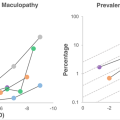 大規模研究における高齢者の近視性黄斑症の有病率を線形スケール(左)と対数スケール(右)で示している。 対数スケールとすることで、5つの研究のデータが類似の傾向にあることや、近視が進むごとにリスクが増加することが示されている。
